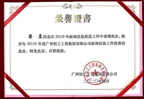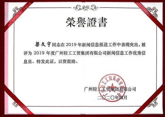 领导的高度重视下,在各职能部门、各企业的大力支持下,在全体新闻信息工作者共同努力下,公司的新闻信息工作继续在广州轻工集团保持优势,排名第一,荣获“2019年度广州轻工工贸集团有限华体会官方网站在线登录入口信息工作先进单位”称号。公司党委办公室梁晨、工会梁文宇被评为“2019年度广州轻工工贸集团有限华体会官方网站在线登录入口信息工作优秀信息员”。