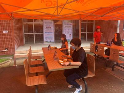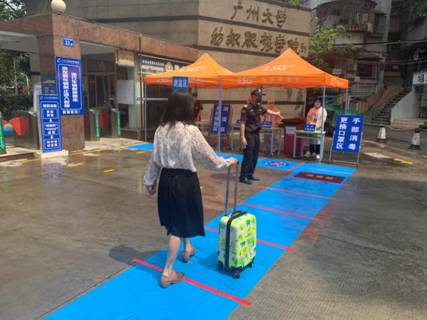 演练分设3个场景,包括返校入门处消毒登记、饭堂就餐、突发事件处置。学生返校后,进入校园前首先经过行李消毒、手部消毒、更换口罩、测量体温等消毒程序,再提供身份证、学生证、穗康码、平安白云等信息进行核对,待工作人员确认后方可进校。在饭堂就餐前要经过测量体温、洗手消毒等环节方可取餐,按每人一桌、相距一米以上标准就餐。对在校园中突发的疑似病患按照应急处理流程,先上报校医务室,再送往临时隔离点进行观察,最后上报松洲街疫情防控工作小组处置,同时对发现疫情的人员进行临时隔离观察,并进行现场消毒处置。