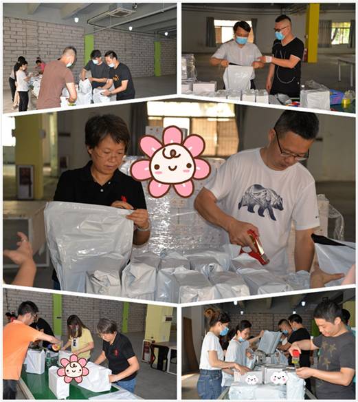 5月31日,临时打包小分队在园区的6号仓、8号仓里的一天的打包工作开始了……按照搬货、装袋、封袋的流程,临时打包小分队成员自觉进行了分组作业,并以小组为单位进一步细化分工,确保各环节的无缝衔接,从而提高打包效率。在闷热的仓库里听到的只有搬运货物、货物装袋、胶纸封袋的声音。从最开始的不熟练,到后来的摸索掌握方法并进行教学分享,再到最后的熟练作业。这样的不断磨合下,临时打包小分队的效率也越来越高,当天下午仅用半个小时就可以完成1板车(350件)货物的打包。在广纺联、广德供应链的共同努力下,云仓5万票的急单终于6月1日顺利完成并寄出。