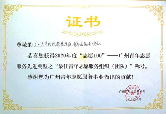 喜报:广州大学纺织服装学院青年志愿者协会荣获2020年度“志愿100”——广州青年志愿服务先进典型之“最佳青年志愿服务组织(团队)”称号