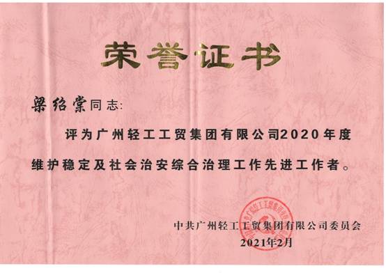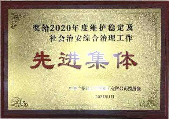 近日,广州轻工集团党委通报表彰了2020年度维护稳定及社会治安综合治理工作先进集体及先进工作者。华体会官方网站在线登录入口-华体会(中国) 荣获“广州轻工集团2020年度维护稳定及社会治安综合治理工作先进集体”荣誉称号。属下托管中心梁绍棠荣获“广州轻工集团2020年度维护稳定及社会治安综合治理工作先进工作者”荣誉称号。