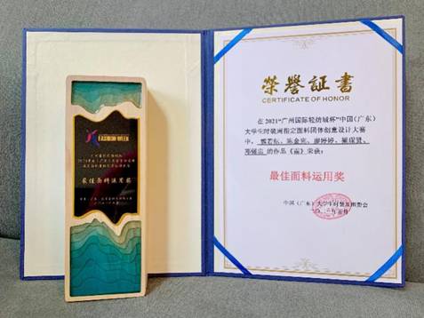 广州大学纺织服装学院代表队在5月份参加了业内各种高含金量的大赛,均取得优异成绩。5月上旬,在2021中国(广东)大学生时装周的首场大秀中,魏若纭老师、陈金完老师和廖婷婷、梁琛贤、邓锡忠三位学生组成的参赛队伍创作的作品《霛》在“广州国际轻纺城杯”指定面料团体创意设计大赛中经过激烈角逐,脱颖而出,荣获“最佳面料运用奖”!