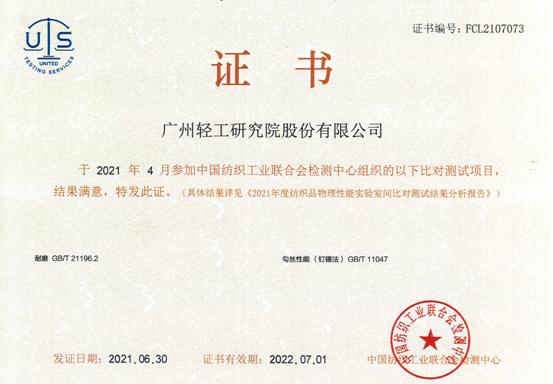 近日,广东广纺检测技术股份有限公司收到由中国纺织工业联合会检测中心组织的“耐磨和勾丝性能(钉锤法)”实验室间比对结果反馈,获“满意”结果评价。