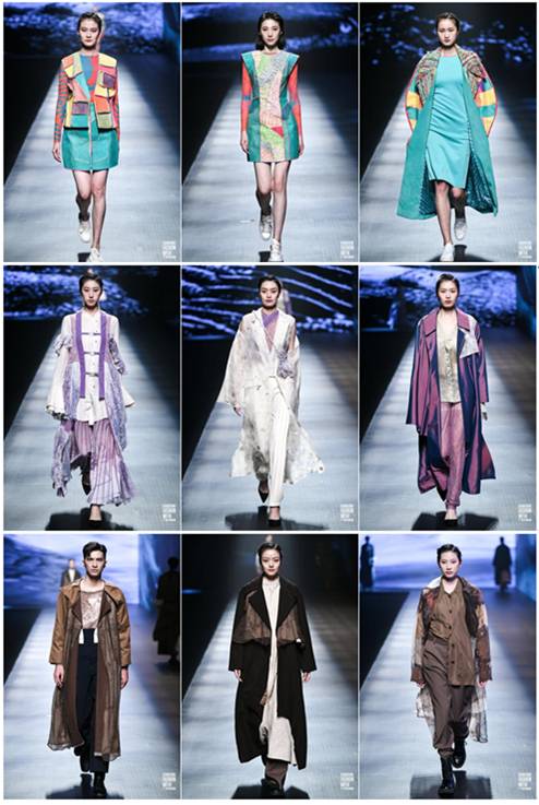 广州大学纺织服装学院及ESMOD广州法国高等服装设计学院此次带来的《以时为针》《渔》《云间没》三大时尚系列将现场走秀推向高潮!《以时为针》系列采用当下盛行的搭配方法,以浓郁的中国配色,解构设计加上休闲廓形的剪裁,在色彩变化、服装面料质地交替间,让人感受到时光的脚步。《渔》系列以非遗物质文化遗产鱼皮工艺融合现代工艺,使用了大量的面料再造和鱼皮拼接,以刺绣、钉珠、拼接、包边、压明线、印花和手缝等工艺,让中国传统文化绽放出时尚魅力。《云间没》系列灵感来源于上古神话常羲浴月,以花卉和蕾丝元素诠释浪漫洒脱的新中式风格,给人一种耳目一新的感觉!