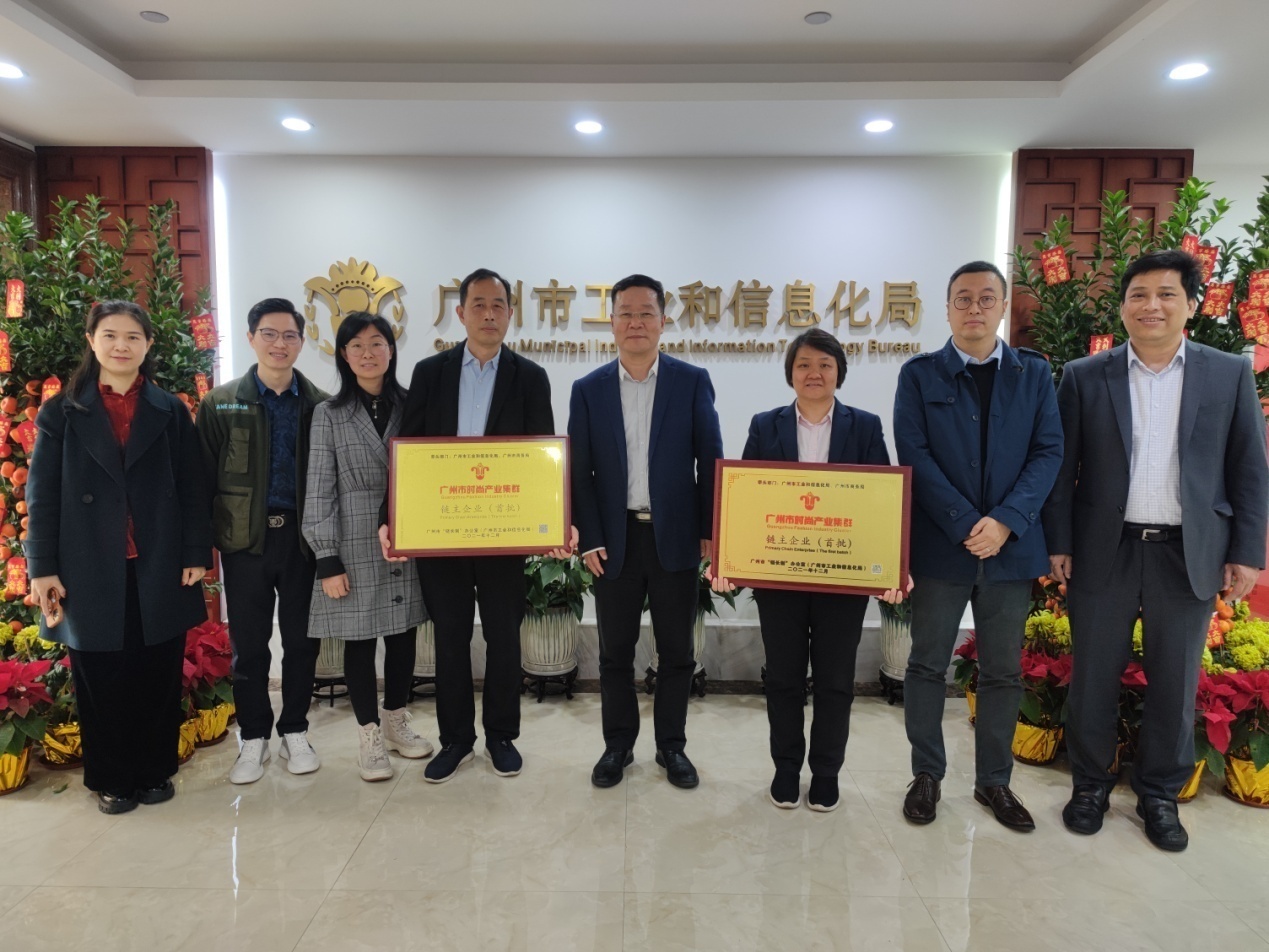 会上还进行了简单而隆重的“链主”企业授牌仪式。广州市工信局副局长张宏伟为两家“链主”企业颁发“广州市时尚产业集群链主企业(首批)”牌匾。