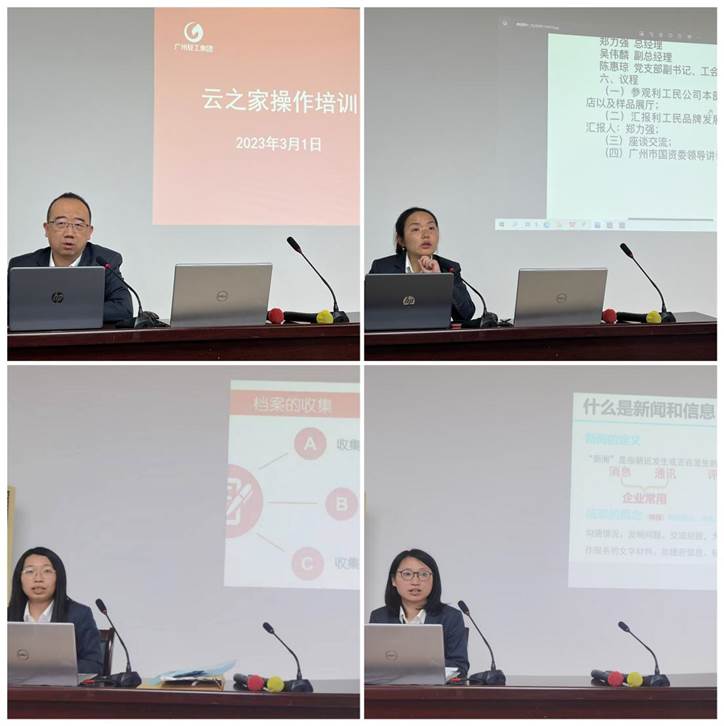 信息中心主任吴华刚详细讲解了云之家OA系统操作流程,为即将启用新OA奠定基础;办公室主任兼利工民党支部书记刘妍主讲办公会务知识。她结合近日利工民接待市国资委调研安排,详细讲述了会务工作的重点;办公室唐雪萍围绕新闻和信息两个元素,阐述撰写宣传稿件的要点,为提升写作水平明晰思路;办公室周洁娴讲解了档案收集和汇总的注意事项,对公司档案管理工作有指导意义。期间,员工积极互动,气氛热烈。