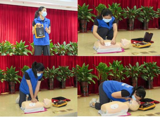 工会、安委等人员一起参加AED使用技能培训。系统学习了如何在急救配件包的帮助下,完成患者衣物的快速脱下、皮肤的清洁、电极片位置的确认、机器的启动,并跟随机器语音指引,完成电极放电,胸部按压,人工呼吸等流程。