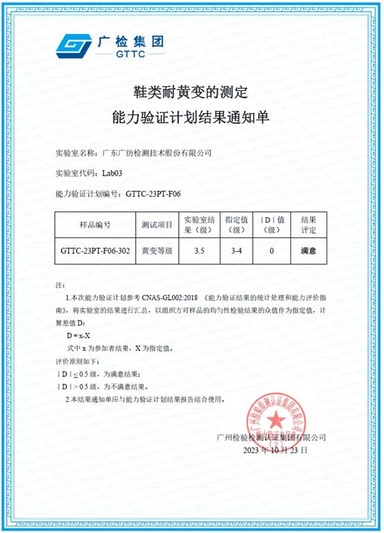 近日,广东广纺检测技术股份有限公司收到参加广检集团组织的能力验证计划结果通知单:“鞋类耐黄变的测定”及“纺织品洗涤和干燥后尺寸变化的测定”两个项目结果满意。