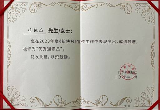 外派干部邓振杰同志在2023年度《新快报》宣传工作中表现突出,成绩显著,被评为“优秀通讯员”。