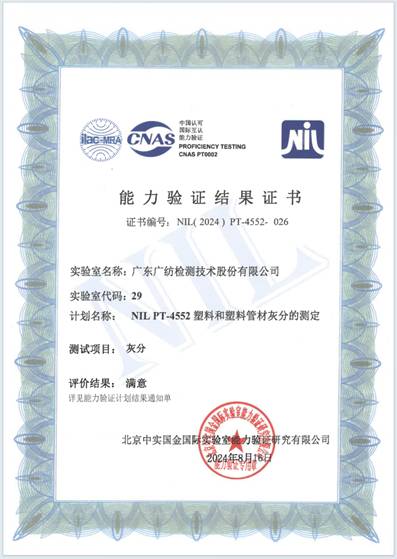 近日,广纺检测公司收到北京中实国金国际实验室能力验证研究有限公司组织的NIL PT-4552 塑料和塑料管材灰分的测定能力验证结果满意证书!