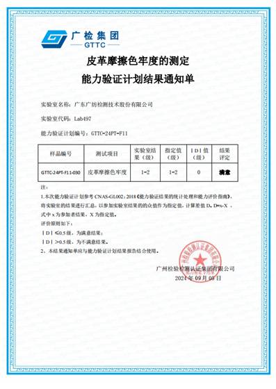 近日,广东广纺检测技术股份有限公司收到广州检验检测认证集团有限公司组织的GTTC-24PT-F11皮革摩擦色牢度的测定能力验证结果满意通知单。