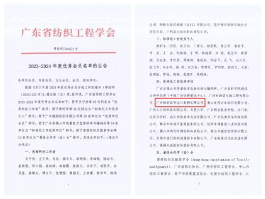 广州纺织品进出口集团有限公司(以下简称“纺出公司”)在2024年广东省纺织工程学会开展的2023-2024年度优秀会员评选活动中,荣获“标准化工作优秀单位”称号。关勇获评为“标准化工作优秀个人”,张菁、陈继成、孙立大和高新武获评为“优秀科技工作者”。这一荣誉是对公司团队专业能力和敬业精神的高度赞扬,也是激励每一位员工继续秉承匠心精神,不断探索与实践,为纺织行业的进步贡献更多力量的巨大动力。