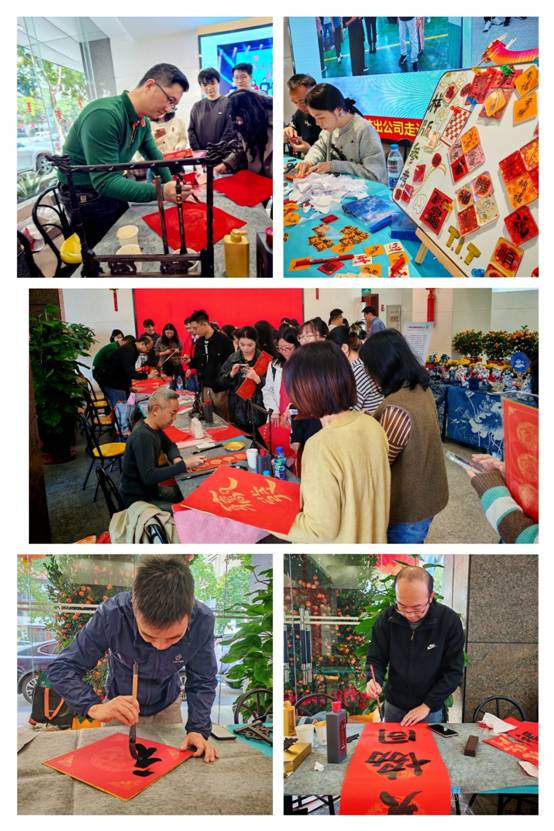 吉祥福手送祝福。在广德一楼大堂,公司4位书法爱好者张汉彬、李运峰、吴宏景、禤俊峰应邀挥墨送福;设计师黄雨桐巧妙手工制作福字冰箱贴,大堂喜气洋洋,年味十足,上百名员工参加现场接福活动。福手们凝神静气,手腕妙转,在一张张红纸上挥洒自如地书写“福”字和各式吉祥春联,一个个苍劲有力或流畅飘逸或趣味可爱的“福”传递到接福的同事们手上,大家眉开眼笑,幸福绽放。这一传统习俗承载公司对广大员工的新年美好祈愿与祝福,场景温馨而充满喜悦。活动现场共送出500多份福字作品。