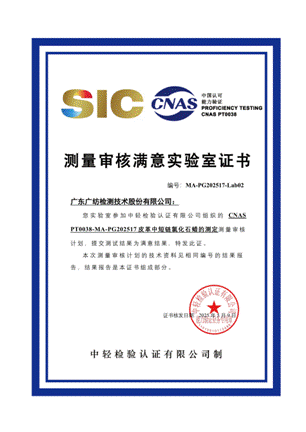 喜报!广纺检测成功通过中轻检验认证组织的CNAS PT0038-MA-PG202517 皮革中短链氯化石蜡测定测量审核,取得“结果满意证书”!