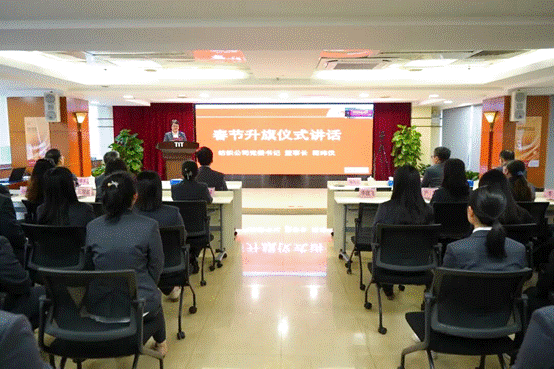 公司在广德大厦15楼礼堂隆重举行升国旗仪式。在雄壮的国歌声中,全体人员肃立注目,表达对伟大祖国的无限热爱和崇高敬意。公司党委书记、董事长简玮仪代表领导班子发表致辞。她指出,过去一年全体纺织人迎难而上、砥砺奋进,圆满完成了“十四五”各项目标任务。2026年是“十五五”规划的开局之年,也是公司实现新跨越的关键之年。她号召全体干部职工紧紧围绕“改革创新齐奋进,智链全球拓新局”年度主题,以“一马当先”的锐气、“快马加鞭”的劲头,锚定目标、聚力攻坚,奋力夺取开局之年“开门红”。